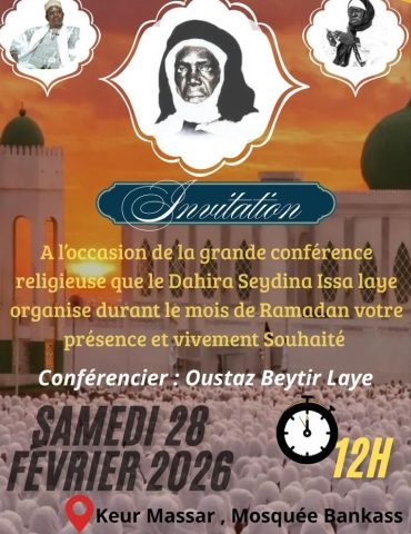 Sokhna Marème Sy LAYE membre du dahira Layène Castors et membre du Daara Xuntama Ngor, petite fille de Baye Issa Fall à Derklé et compagnie, vous prient d’honorer de votre présence à la conférence religieuse qu’elle organise le samedi 21 Février 2026.