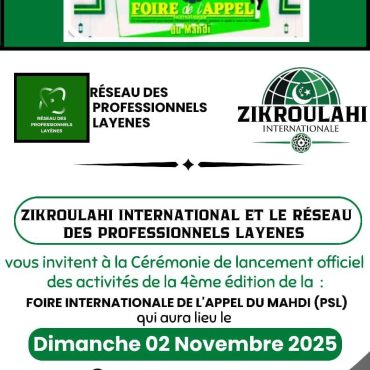 02 Nov 2025 Yoff Layène - Préau de la mosquée — Dakar LANCEMENT 4ème EDITION DE LA FOIRE INTERNATIONALE DE L’APPEL DU MAHDI (PSL)- Dimanche 02 novembre 2025 En savoir plus