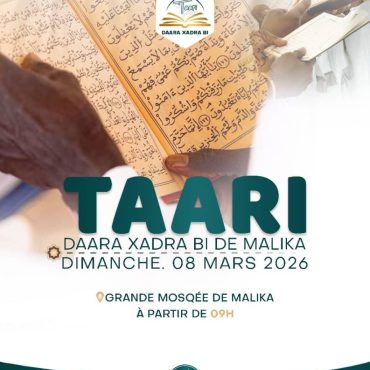 08 Mar 2026 Préau de la Mosquée de Malika — Keur Massar TARI 2026 : Daara Xadra-Bi de Malika- Dimanche 08 mars 2026 Daara Xadra-Bi de Malika En savoir plus