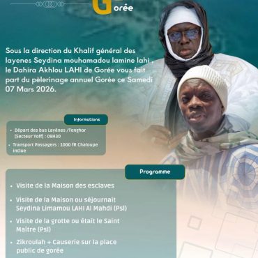 15 Mar 2026 Gouye Mariama Layène — Dakar CONFERENCE ANNUELLE DU REGROUPEMENT DES LAYENES DE DAKAR- Dimanche 15 mars 2026 Regroupement des Layènes de Dakar En savoir plus