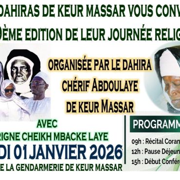 01 Jan 2026 Keur Massar - derrière la Gendarmerie — Keur Massar 9ème édition JOURNEE RELIGIEUSE DU DAHIRA CHERIF ABDOULAYE DE KEUR MASSAR- Jeudi 1er janvier 2026 Dahira Chérif Abdoulaye de Keur Massar En savoir plus