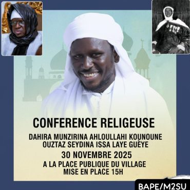 30 Nov 2025 Place publique du village — Rufisque CONFÉRENCE DAHIRA MUNZIRINA AHLOULLAHI DE KOUNOUNE- Dimanche 30 novembre 2025 Dahira Munzirina Ahloullahi En savoir plus